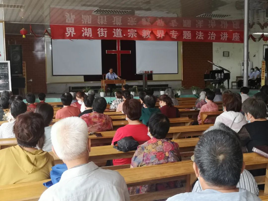| 为进一步学习宣传民法典和民族宗教法规规章,提高民族宗教工作法治化水平,7月3日,界湖街道办事处宣统办、界湖司法所联合举办界湖街道宗教界法治专题讲座,界湖基督教堂共150余名宗教人士参加了此次讲座。 |